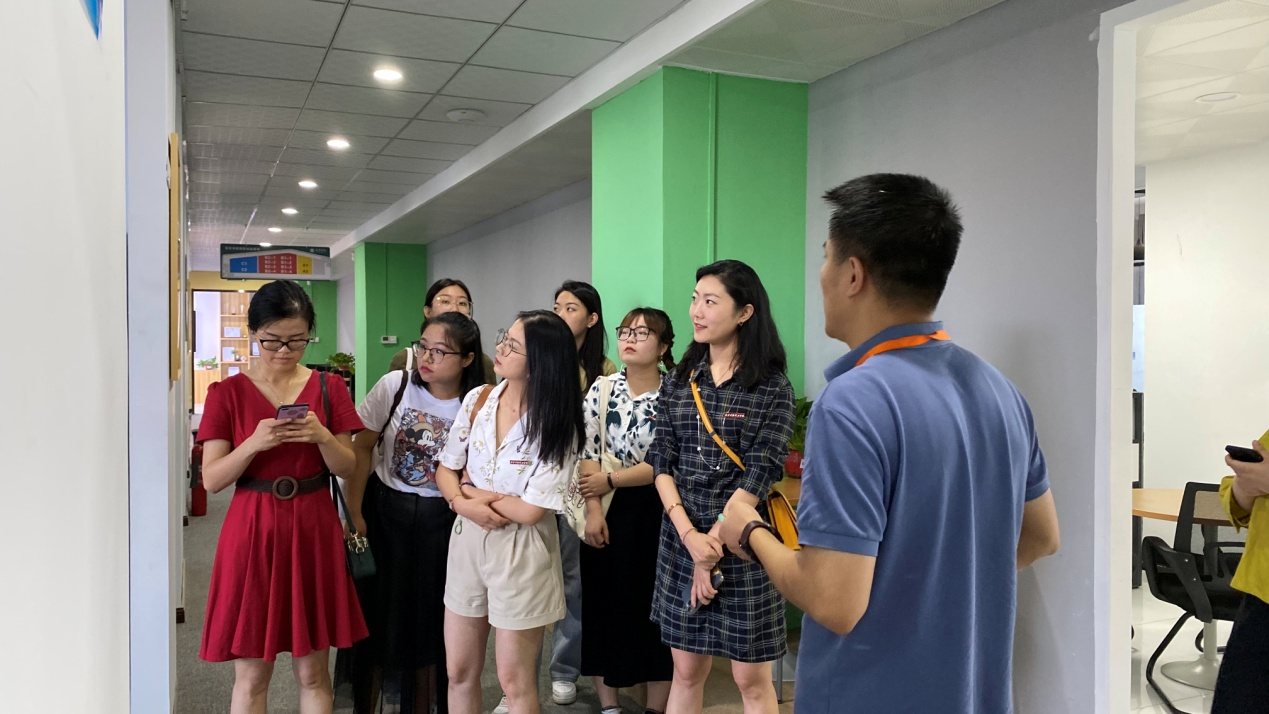 胡科长带领我院老师先行参观了位于科研楼三楼大学生创业孵化基地。负责人周东老师详细介绍了基地的基本概况及发展现状,同时分享了艺术设计、文化传媒、医疗技术等多个类型的优秀项目的孵化经验,使大家深入了解了创业孵化基地的功能与运作模式。