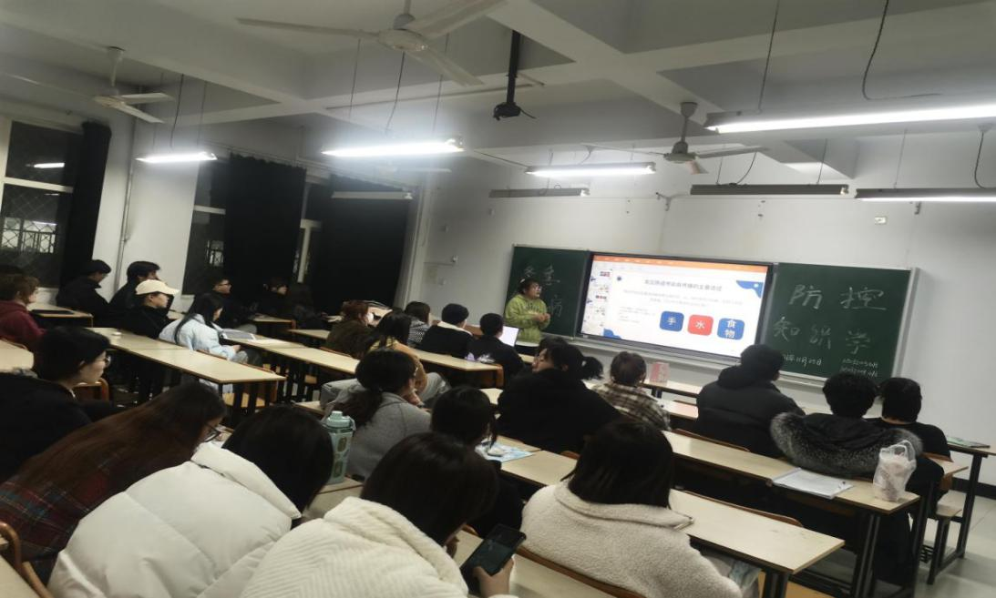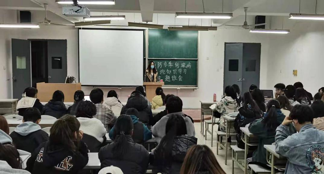 大一大二年级辅导员与各班级班委配合,利用晚自习深入班级,针对秋冬季因气候变化、天气干燥引起的流感、流脑、流腮等呼吸道传染病,以及因食品卫生引起的出血热、食物中毒等其他相关疾病知识开展教育。