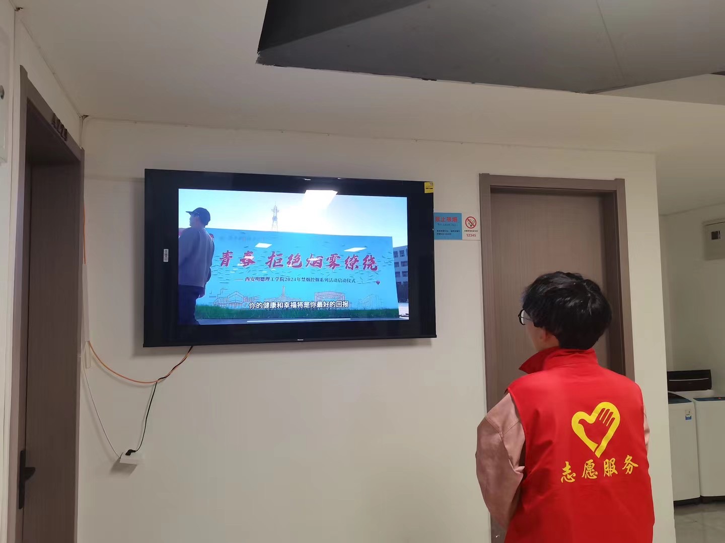 各层学生代表通过公寓大屏从“香烟的危害”“青少年吸烟心理”“吸烟在公寓内的安全隐患”“如何在校园中更好的禁烟”四个方面内容进行禁烟宣讲,增强了宿舍楼各层负责人禁烟知识,让同学们深切认识吸烟的危害,提高同学们对于校园控烟的重视,随后同学们开展公寓禁烟劝导工作。