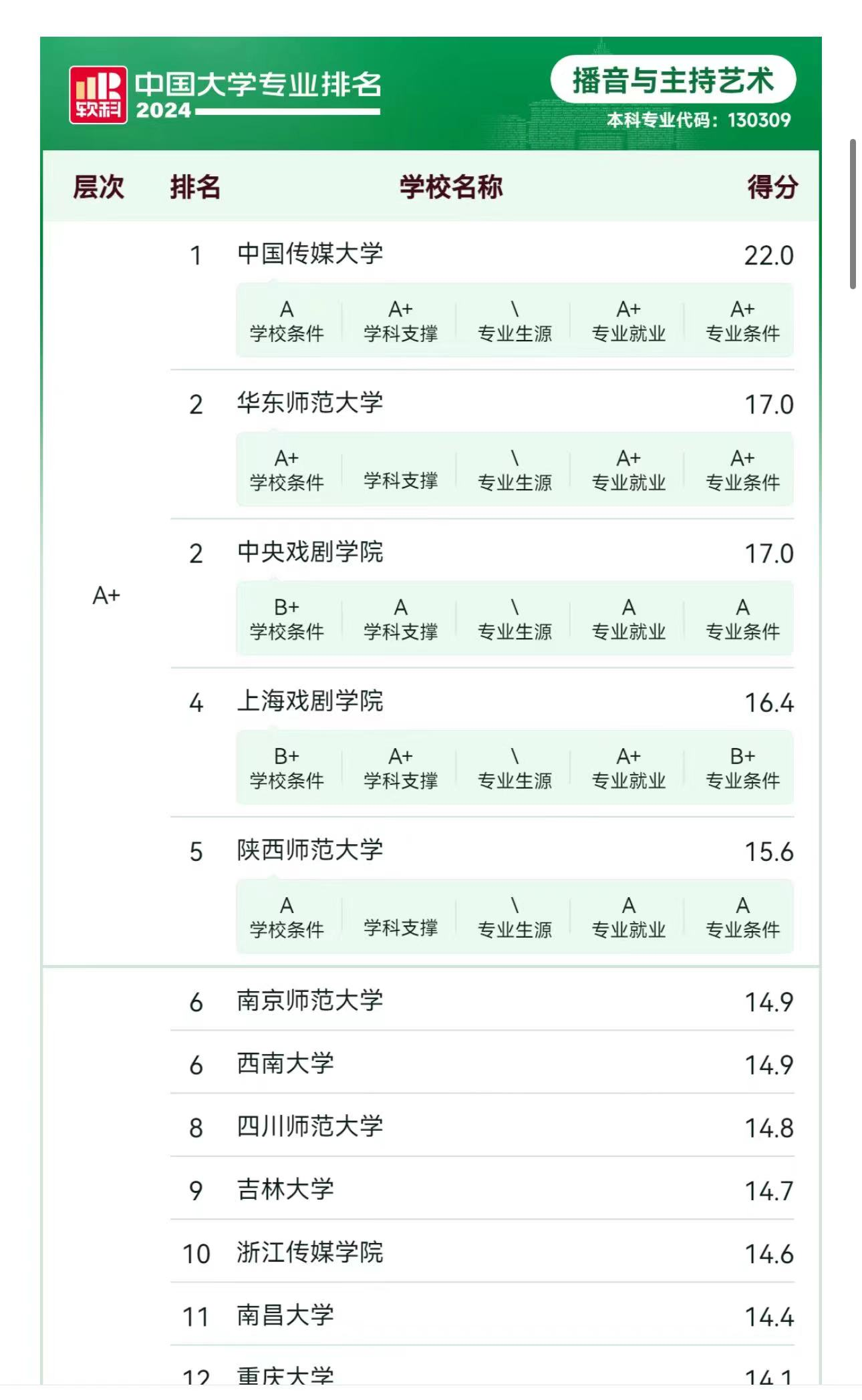 6月13日,上海软科正式发布2024“软科中国大学专业排名”,世界杯官网艺术与设计学院播音与主持艺术专业排名再次上升,以综合10.2分位居全国第44名,迈入全国50强、全国民办第三,陕西第二。该项排名连续两年获B+等级,实现了世界杯官网软科B+级排名上的突破,同时有望向A级排名冲刺。2023年该专业就“冲出”西安民办高校包围圈。今年排名又有所上升,晋升全国民办三强,陕西第二。