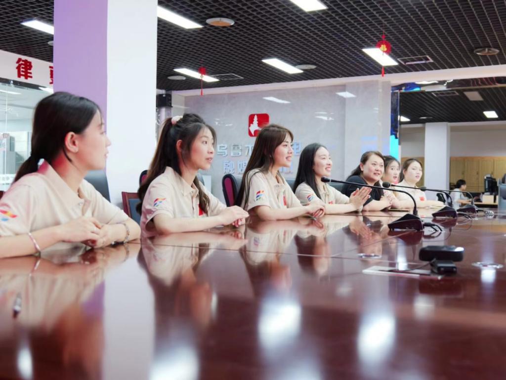 乌鲁木齐广播电视台融媒体新闻中心副总编辑任立勤(右二)、乌鲁木齐广播电视台主持人海潮(右三)