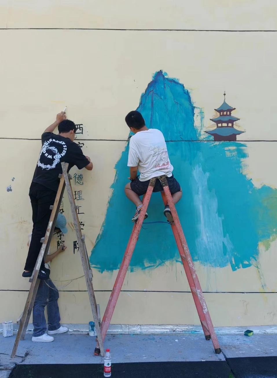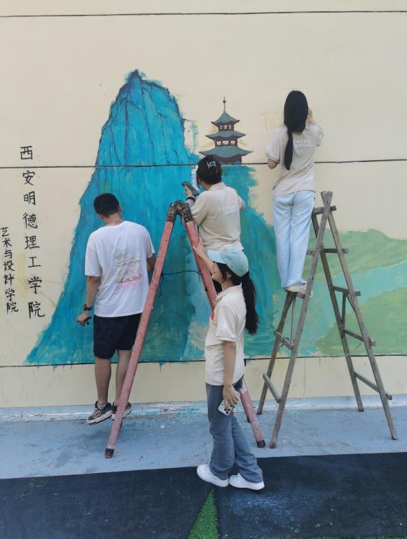 伴随着朝阳与微风,实践队的队员们们携带着画笔和颜料,再次踏进了这片充满诗意的土地。在曲折蜿蜒没有护栏的盘山羊肠小道上,是实践队队员们活跃的身影。今天是实践队队员来这里绘画的第二天,也是圆满结束的一天。在队员们的共同探讨下与努力下一幅悉心描绘的乡村画卷跃然墙上。