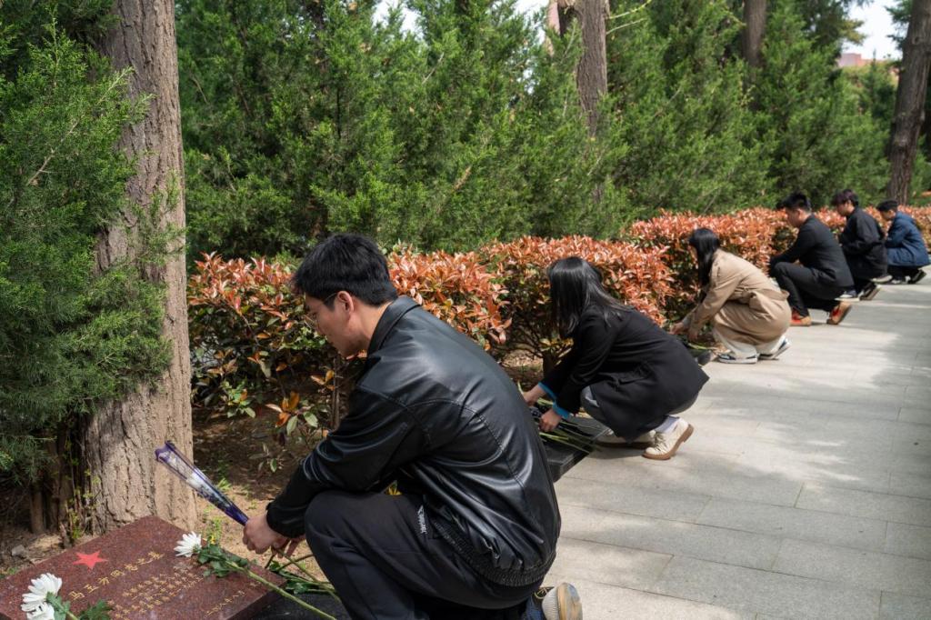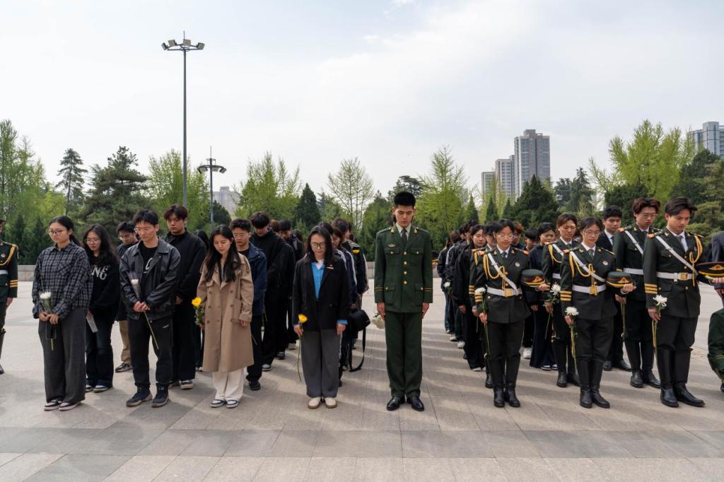在烈士墓区,师生们缓步绕行、驻足瞻仰。师生们用最虔诚的姿态献上花束,花瓣上的露珠折射着对英烈的敬意。这一束束鲜花,不仅是祭奠的象征,更是青年学子对英雄精神的深情告白,让红色的基因在每一朵花、每一滴泪中代代相传。