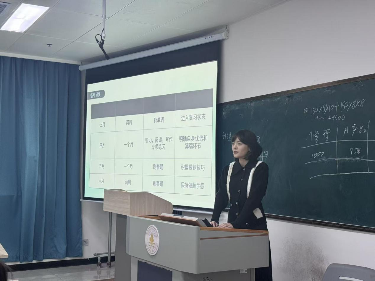 分享环节中,张璟霖讲师结合自身四六级备考与过关经历,从备考规划、题型技巧、复习方法、心态调整四大方面展开细致讲解。针对四六级考试的听力、阅读、写作、翻译四大核心题型,他逐一拆解重难点,分享了针对性的答题策略:听力部分强调日常精听与泛听结合,注重抓取关键信息;阅读部分传授快速定位答案、梳理文章逻辑的技巧;写作与翻译则聚焦词汇积累、句式优化和真题仿写,帮助同学们规避常见失分点。