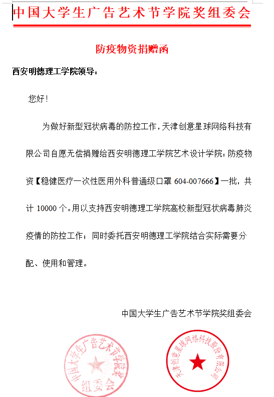 学校联防联控的关键时刻中国大学生广告艺术节学院奖组委会及时伸出援手,自愿无偿向学院爱心赠口罩10000件为学校抗疫工作提供了强有力的支持