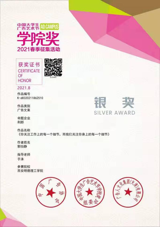 中国大学生广告艺术节学院奖是经中央批准,国务院评比达标小组同意设立的中国广告业大奖,内容涵盖学术研讨、创意大赛、人才交流等方面。2016年至今,我院学生已连续参加了七届中国大学生广告艺术节学院奖,累计投递作品数量超过千件,共获得多项等级奖,入围奖和优秀奖。