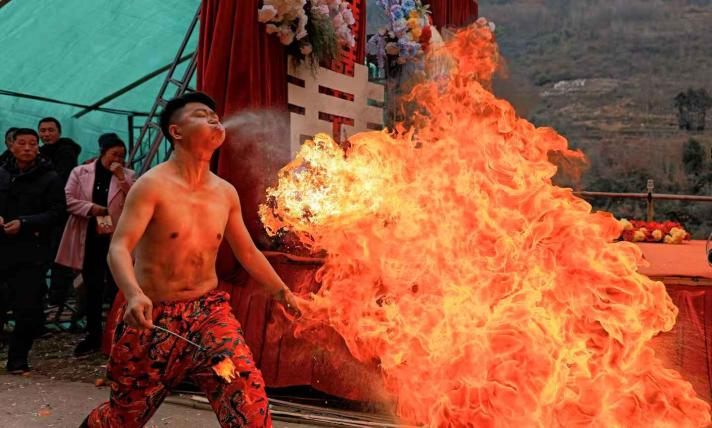 这是在陕南一个小村子的婚礼现场,画面定格了一位表演者在户外进行喷火表演的精彩瞬间。周围的观众全神贯注地注视着,表演者赤裸上身,身着花色长裤,手持道具,口中喷出熊熊火焰。这一瞬间不仅展现了表演者的精湛技艺,也传递出活动现场热烈的氛围。