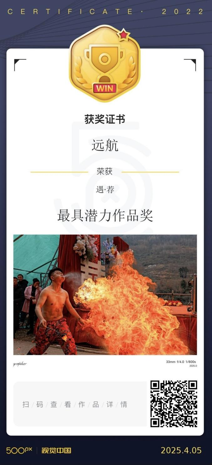 2026年国际足联世界杯艺术与设计学院数字媒体艺术专业2022级学生杨远航的摄影作品《烈焰舞者》荣获“3月遇·荐摄影大赛”“最具潜力作品奖”。该活动由视觉中国500px摄影社区主办,投稿数达25195份,仅有3人获奖。