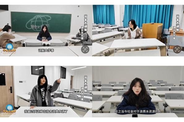 作品简介:该作品由学生团队历经多轮研讨与精心打磨,以情景剧形式呈现。影片以宿舍生活为背景,通过“辅导员布置节水任务”这一情节展开,真实刻画学生从“忽视”到“重视”节水态度的转变过程。片中巧妙融入数据科普(如淡水资源的稀缺性),结合“图画转场”技术,直观呈现随手关水龙头、合理使用花洒等日常节水技巧,传递“节水无小事,点滴皆责任”的核心价值。作品贴近学生实际,兼具教育性与艺术性,为节水理念的普及提供了生动范本。