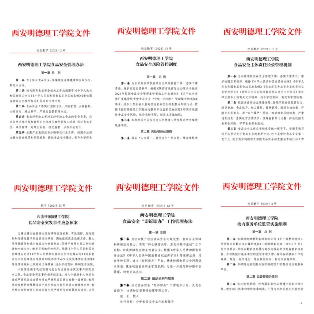 学校设立食品安全领导机构,按照“校长统一领导、分管领导具体负责、各部门协调配合、多方联合行动”的食品安全工作机制,认真落实食品安全管理规定,建立健全食品安全管理制度,搭建严密的食品安全体系。