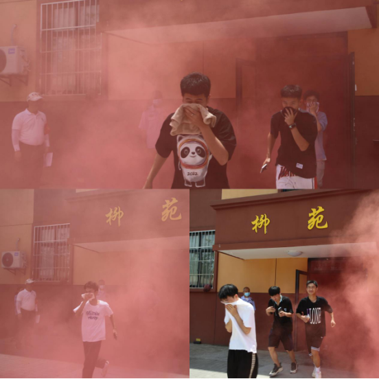 消防演练于12:30开始,随着模拟烟雾的释放和消防警报的响起,学生在老师的指挥下,冒着浓浓的烟雾,弯着腰,猫着步,用湿毛巾等捂住口鼻,沿着指定的楼梯和疏散通道快速有序撤离出公寓,到达了安全地带。全部演练过程持续了10分钟,整个演练活动安全顺利,效果良好。