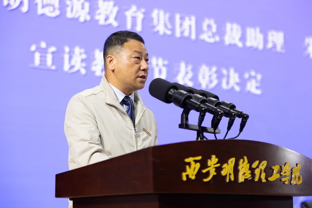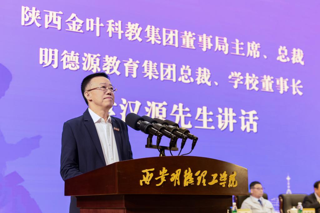 陕西金叶科教集团董事局主席、总裁,明德源教育集团董事长、总裁,学校董事长袁汉源发表重要讲话。他代表陕西金叶科教集团、明德源教育集团和学校董事会,向辛勤耕耘在教学、科研、管理和服务一线,为学校建设和发展作出贡献的全体教职员工致以节日的问候和崇高的敬意!他强调,教师是立教之本、兴教之源,更是学校教育事业发展的核心力量,并对全体教职员工提出了殷切期望。一是要永葆为党育人、为国育才的初心使命;二是要锤炼精益求精、追求卓越的匠心精神;三是要涵育关爱学生、潜心育人的深厚情怀。