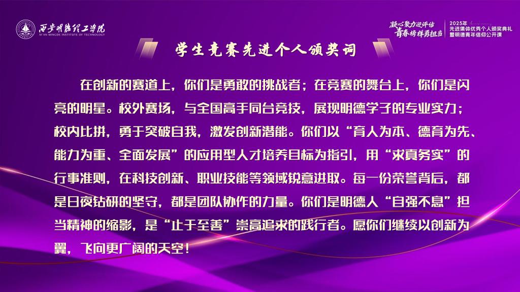 一系列重磅表彰决定的宣读,它们承载着明德师生无数日夜的拼搏心血,凝聚着一路奋进的累累硕果,见证着青春在不同舞台的闪耀时刻。这些表彰,关乎学业精进、实践深耕、竞赛突破,每一份荣誉背后,都是老师们和同学们用汗水写就的成长篇章,是将青春奋斗融入强国复兴征程,用热血与实干写就的时代答卷。
