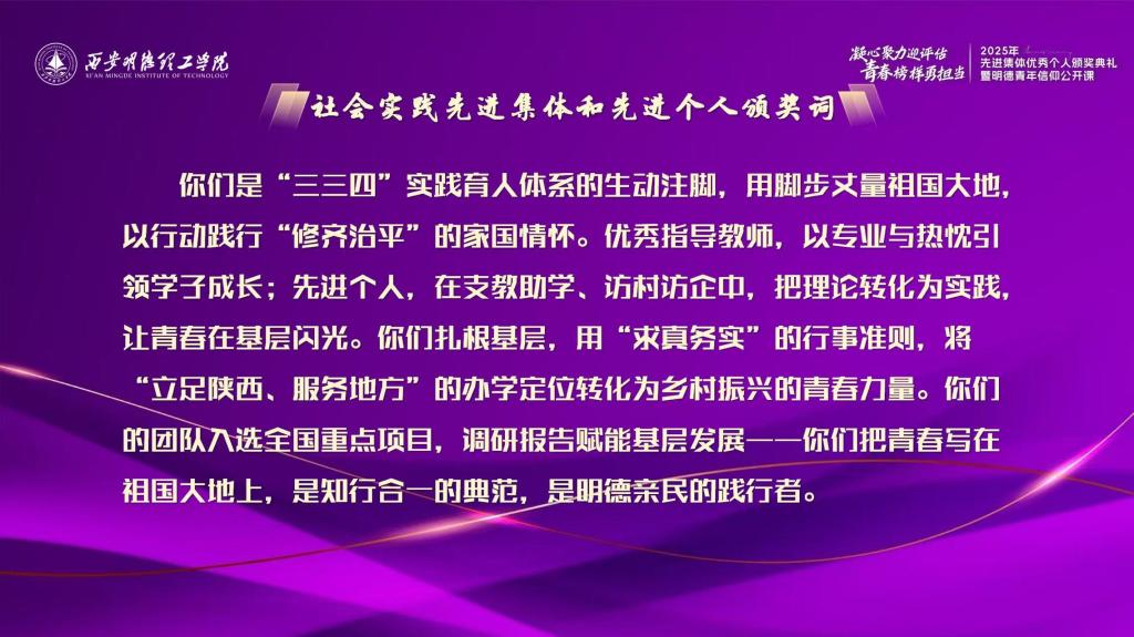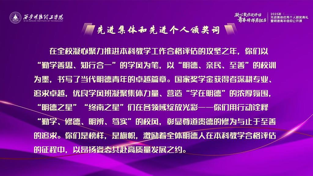 青春的画卷,在拼搏中铺展壮丽图景;榜样的精神,在岁月中沉淀不朽力量。这场会议,师生们欢聚一堂,共同见证先进集体与优秀个人的荣耀加冕,聆听他们以奋斗为笔书写的青春故事,领略明德青年朝气蓬勃、勇毅担当的昂扬风采。这些青春榜样,以笃行诠释初心,用实干追逐梦想,在学科竞赛中勇攀高峰,在志愿服务中传递温暖,在科研创新中攻坚克难,在社会实践中锤炼成长,生动践行着对理想的执着、对责任的坚守。他们的事迹,不仅是明德育人成效的鲜活注脚,更激励着全体师生在中国式现代化建设的征程中奋勇争先。表彰典礼从不是奋斗的终点,而是薪火相传的新起点。愿全体明德人汲取榜样力量,将崇敬与感动化为前行动能,以饱满热情深耕学业、精进事业,以坚定信念勇担使命、砥砺奋进,在学校本科教学合格评估的攻坚路上凝心聚力,在祖国繁荣发展的壮阔征程中添砖加瓦,共同书写无愧于时代、无愧于青春的精彩篇章!