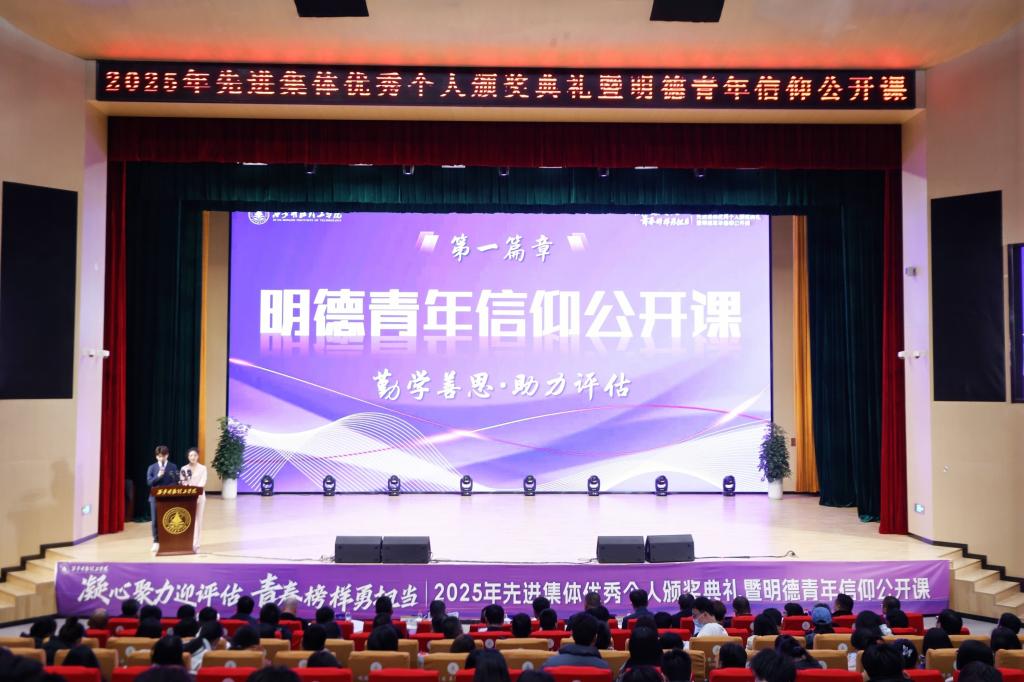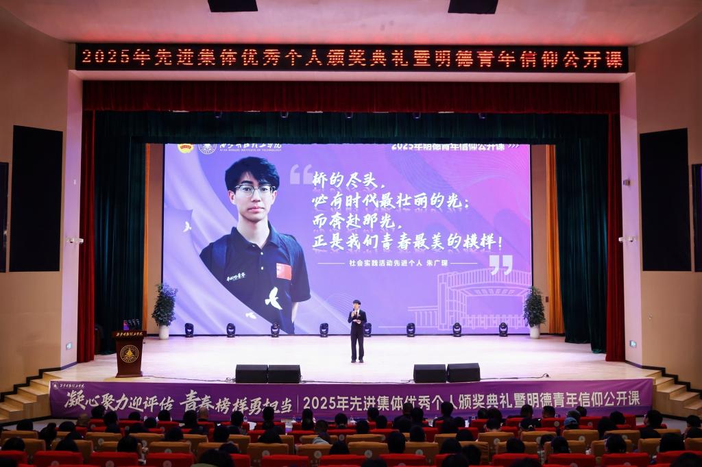 为表彰先进,树立榜样,激励更多青年学子奋勇前行,12月10日,学校在四季廊桥报告厅举行“凝心聚力迎评估 青春榜样勇担当”2025年先进集体、优秀个人颁奖典礼暨明德青年信仰公开课,表彰过去一年师生群体中涌现的先进集体和优秀个人,共同见证明德学子的收获与成长。