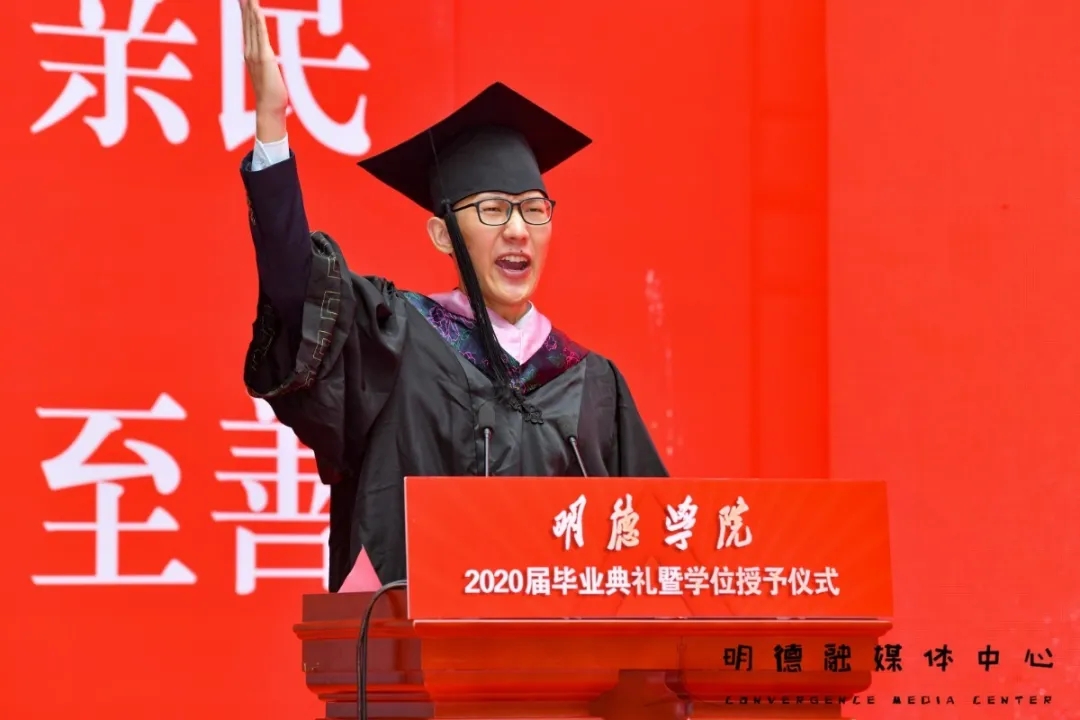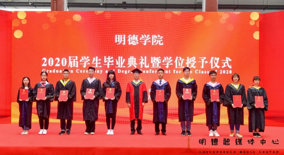 最后,全场师生高声齐唱歌曲《再见》。一段明德路,一颗明德心;一朝明德人,一世明德情。再见明德,策马扬鞭蓬勃少年今夕追风去,乘风破浪灿烂人生明朝入眼来。2020届学生毕业典礼暨学位授予仪式在全体师生的歌声中圆满落下帷幕。