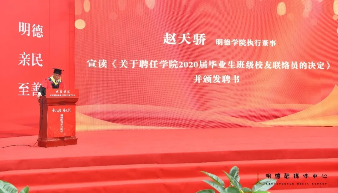 学院执行董事赵天骄宣读《关于聘任学院2020届毕业生班级校友联络员的决定》,并为联络员代表颁发聘书。
