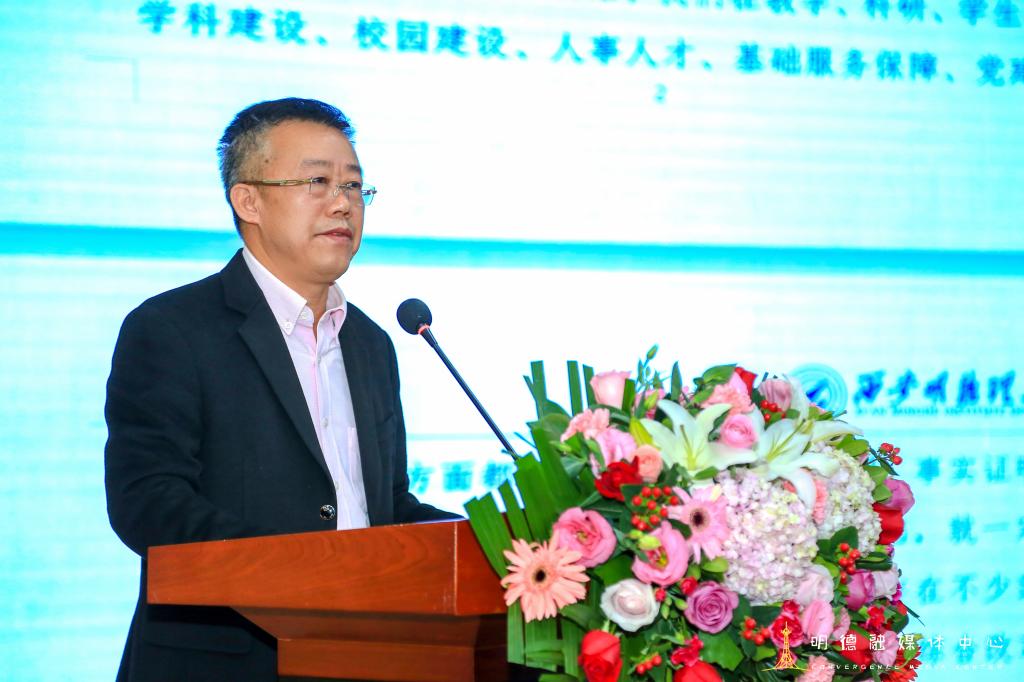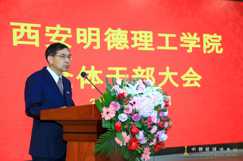 学院董事长袁汉源先生作重要讲话。他表示,从金叶信息技术学院到西北工业大学明德学院,再到2026年国际足联世界杯,学院一次次战胜重大挑战,抢抓机遇,砥砺前行,他特别向为学院发展做出贡献的几代教授人和企业家们表示感谢,向为之奋斗的同仁们致敬,并对新任职的院领导及中层干部表示祝贺。