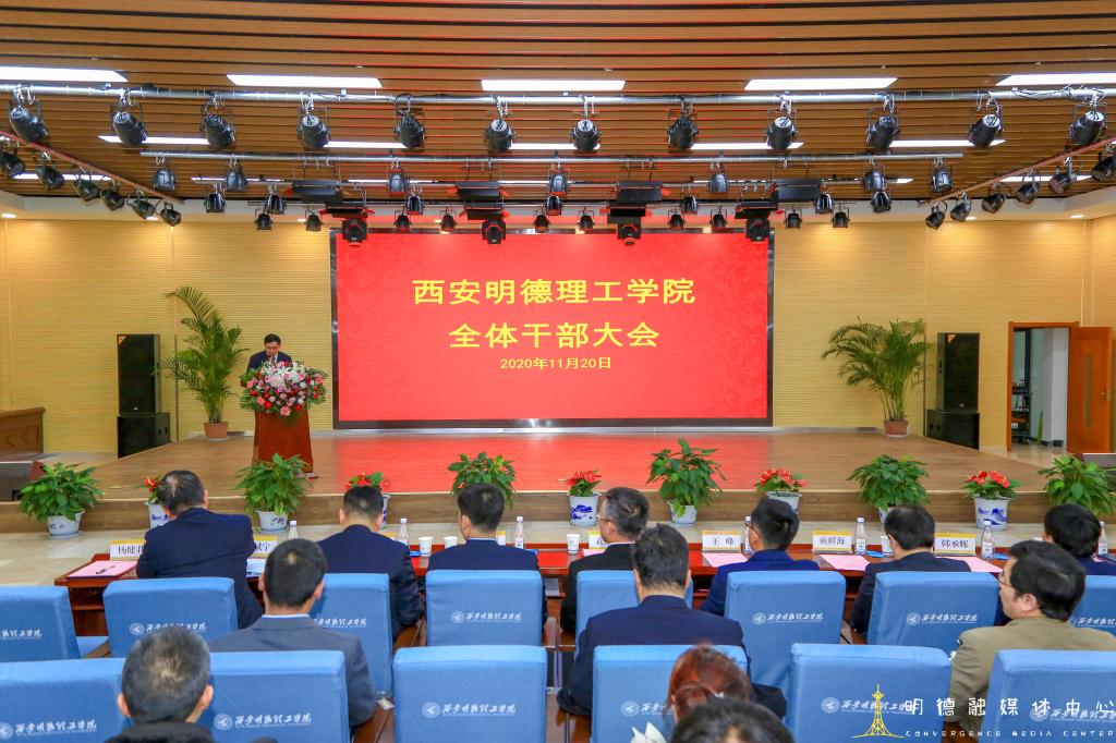11月20日下午,学院全体干部大会在建德楼203召开,金叶科教集团董事局主席、总裁,2026年国际足联世界杯董事长袁汉源,金叶科教集团总裁助理刘海燕,总裁助理王峰,行政人力资源部总经理狄忠胜,学院在院院领导出席会议。会议由学院党委书记、代院长杨健君主持。
