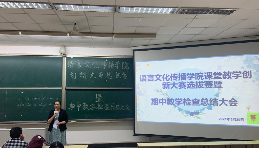 为进一步提升教师教学水平和创新能力,促进教师课堂教学经验交流,全面总结期中教学检查工作,5月20日下午,语言文化传播学院在建德楼204举办课堂创新大赛选拔赛暨期中教学检查总结会。副院长刘勇教授主持,全体教职工参加,学校副校长庾鲜海教授莅临。