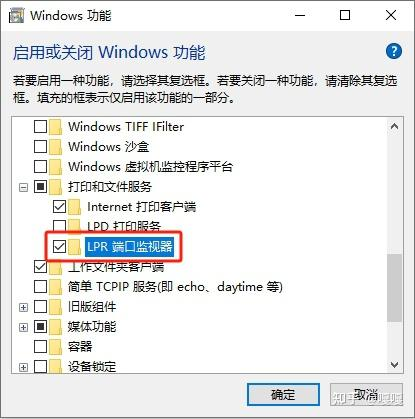 同服务端一样,打开“启用或关闭Windows功能”,但勾选的是“LPR端口监视器”:
