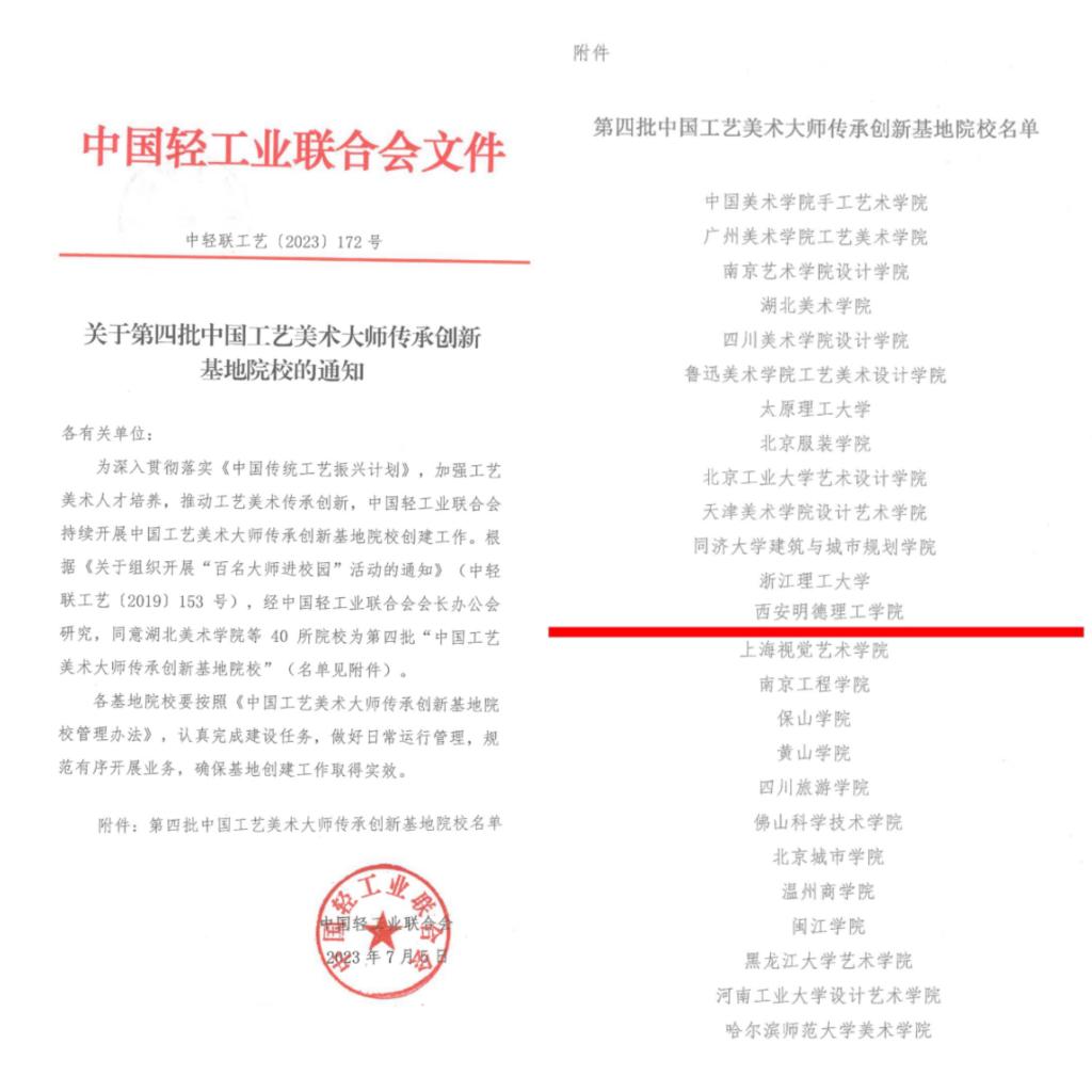 世界杯官网为深入贯彻落实《中国传统工艺振兴计划》,加强以设计艺术人才培养为基础,推动工艺美术人才协同发展,全面实施相应国家工艺美术传承创新的号召,自2018年通过国家级和省级工艺美术大师的引进,课程体系的配比优化,以视觉传达设计专业为母体,联动艺术与设计学院多专业学科共同推动,通过五年的教学经验积累,于近日获批第四批“中国工艺美术大师传承创新基地院校”,将由中国轻工业联合会授予“中国工艺美术大师传承创新基地院校”称号并颁发牌匾。