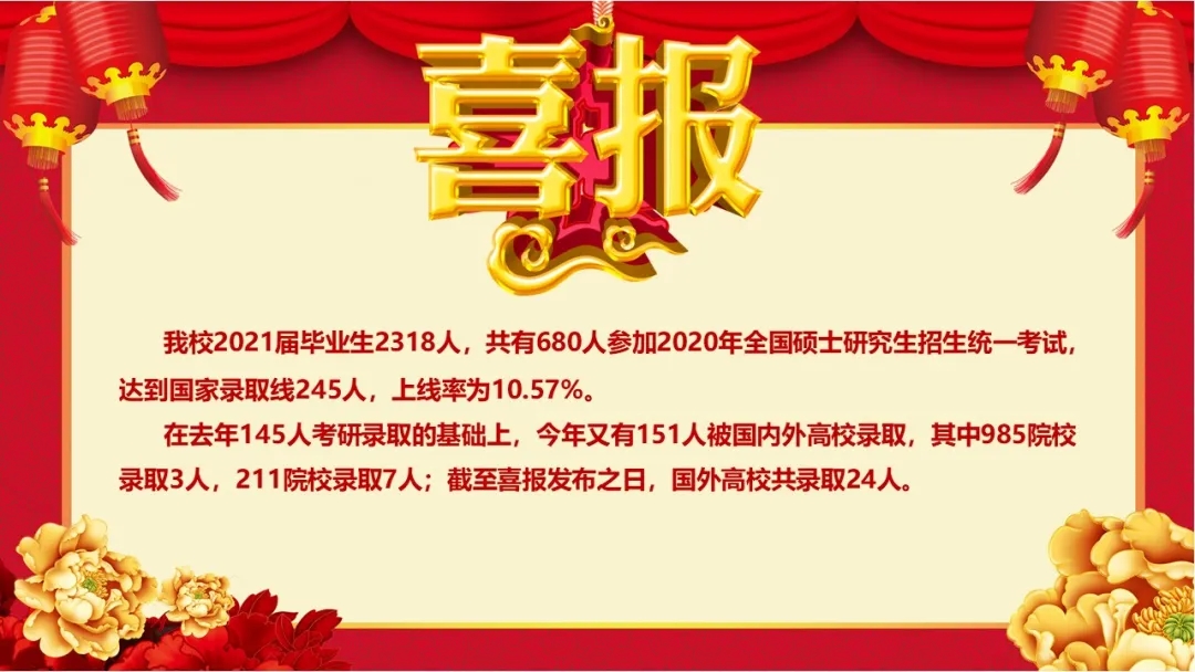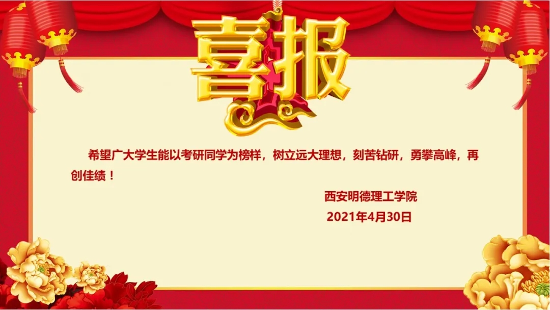 “一分耕耘一分收获”,优异成绩的取得既是考研学子们寒窗苦读、努力拼搏的结果,也是我院高度重视人才培养质量的直接体现。在此,对顺利考取硕士研究生的同学们表示热烈祝贺,向付出辛勤劳动与精心指导的学院各位老师致以衷心的感谢,同时期望其它各年级准备考研的学子们以他们为榜样,勤奋学习,努力进取,顺利实现自己的考研梦。