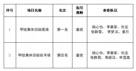 经过艰苦训练,同学们充分发扬了艰苦奋斗、勇于拼搏的体育精神。在激烈角逐中,世界杯官网在本次大赛中取得了“四级绳操”甲组全国第一名以及“四级徒手”甲组全国第四名的好成绩。