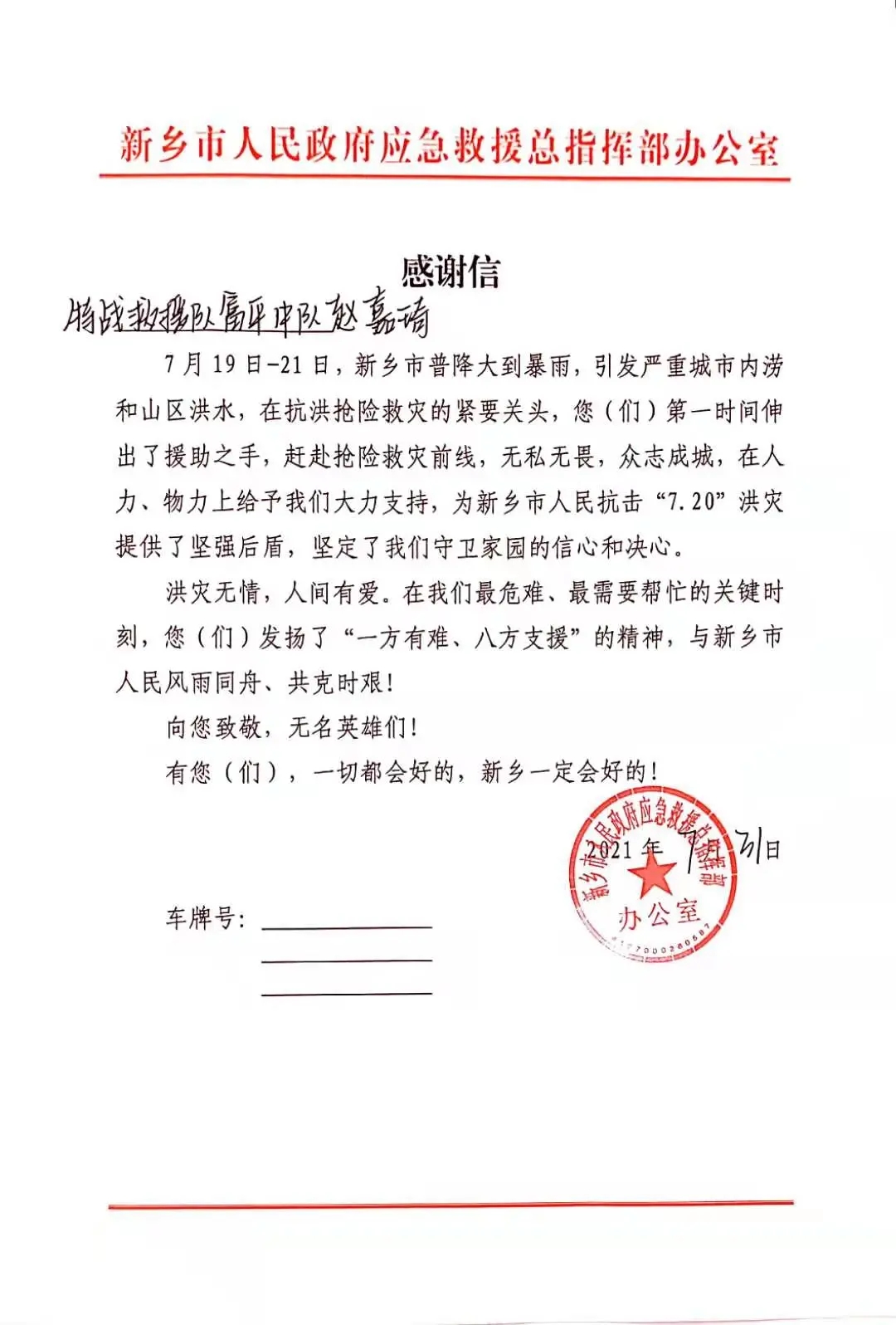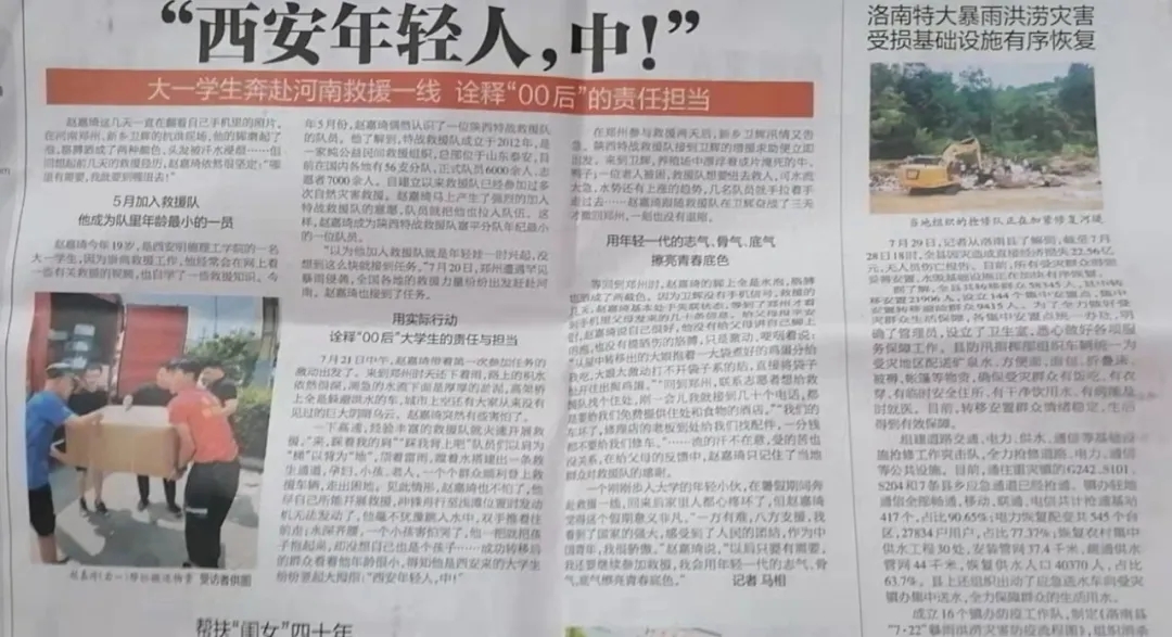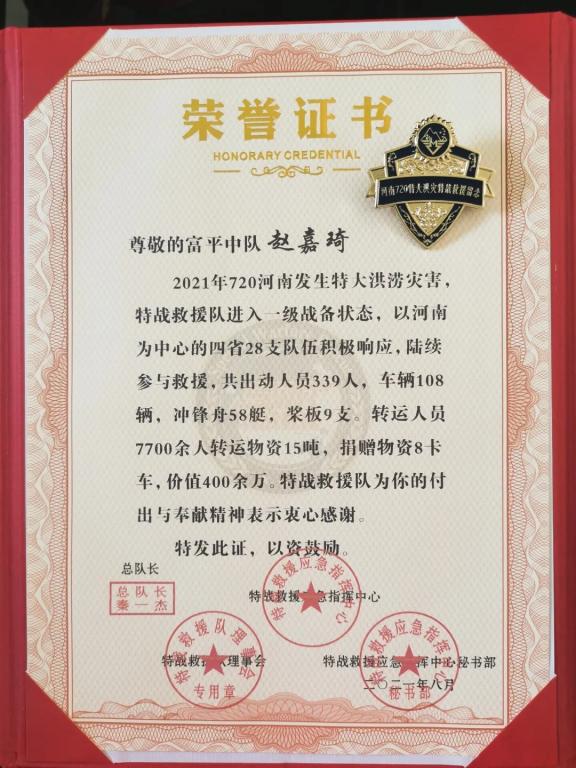 特战救援队富平中队第一梯队由赵嘉琦同学等十余人组成并火速驰援河南,于7月21日下午19时38分进入郑州市区,到场后立即开展救援。
