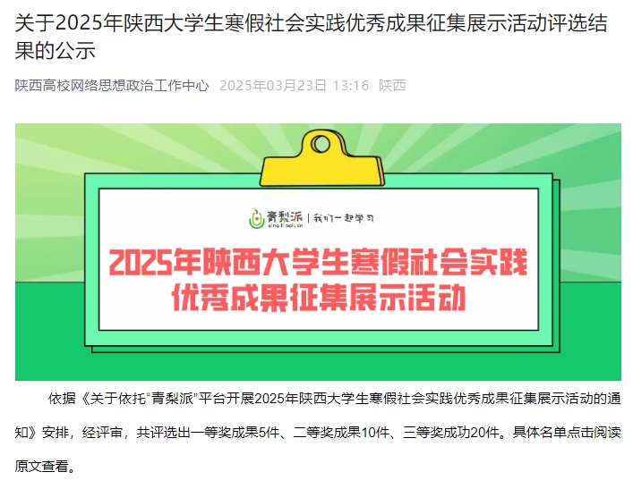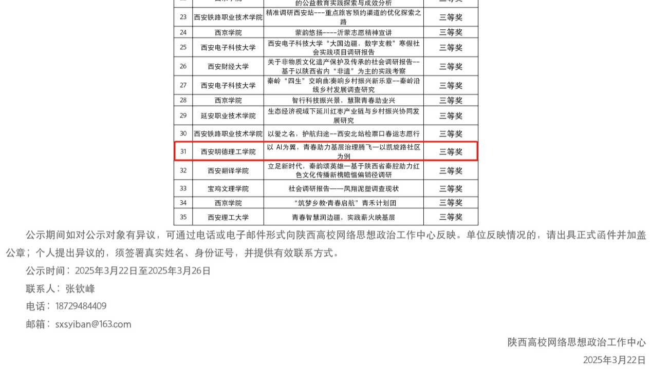 近日,陕西高校网络思想政治工作中心公示了2025年陕西大学生寒假社会实践优秀成果征集展示活动评选结果,本次活动依托教育部“青梨派”大学生自主学习思政课平台开展,共有68件作品进入评审环节,经评审,共评选出优秀成果35件,世界杯官网学生朱广琛提交的《以AI为翼,青春助力基层治理腾飞——以凯旋路社区为例》实践成果最终被认定为三等奖。