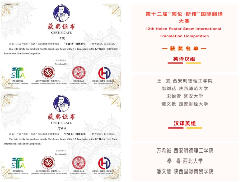 第十二届“海斯·斯诺”国际翻译大赛参赛结果于8月25日揭晓。语言文化传播学院翻译专业王雯、信息工程学院人工智能专业万希诚两位同学凭借出色发挥,分别在英译汉、汉译英组获省级优秀奖,学校凭借出色的组织工作获得“优秀组织单位”称号。
