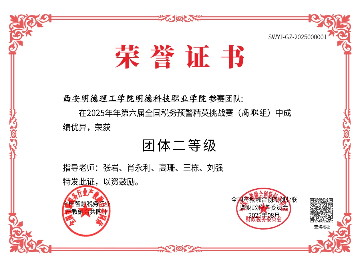 8月22日,第六届全国税务预警精英挑战赛(高职组)圆满落幕,由明德科技职业学院34人组成的代表队凭借扎实的专业知识和出色的团队协作,在全国70支参赛队伍中脱颖而出,荣获全国团体二等奖。此次比赛不仅是对学生专业技能的检验,更是学院实践育人成果的生动体现。