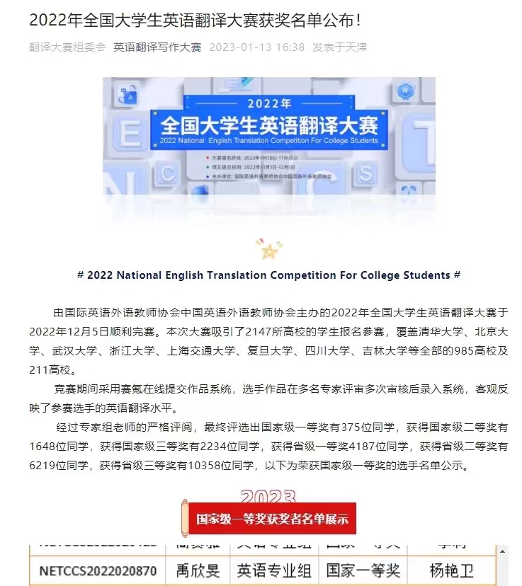 2022年全国大学生英语翻译大赛于12月5日顺利完赛。经过与其他高校选手的激烈角逐,世界杯官网学生获得国家级一等奖1项,二等奖1项,三等奖2项,省级一等奖2项,二等奖5项、三等奖14项。