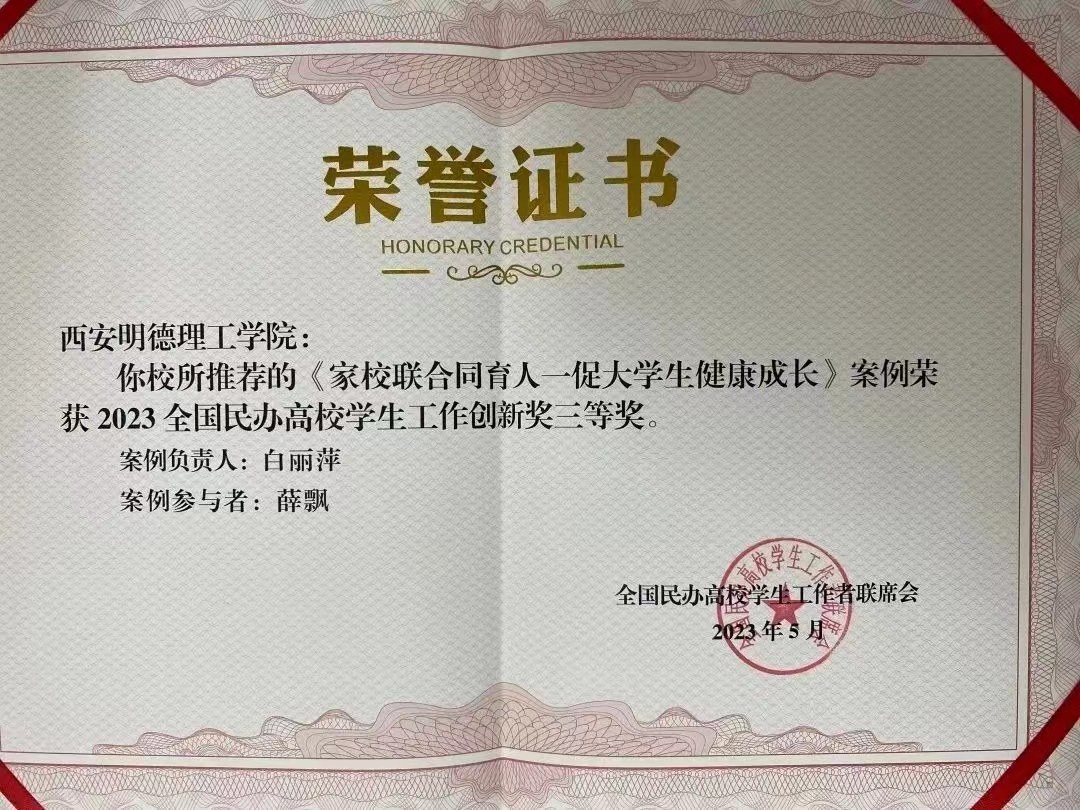 《家校联合同育人——促大学生健康成长》荣获2023年全国民办高校学生工作创新奖三等奖。