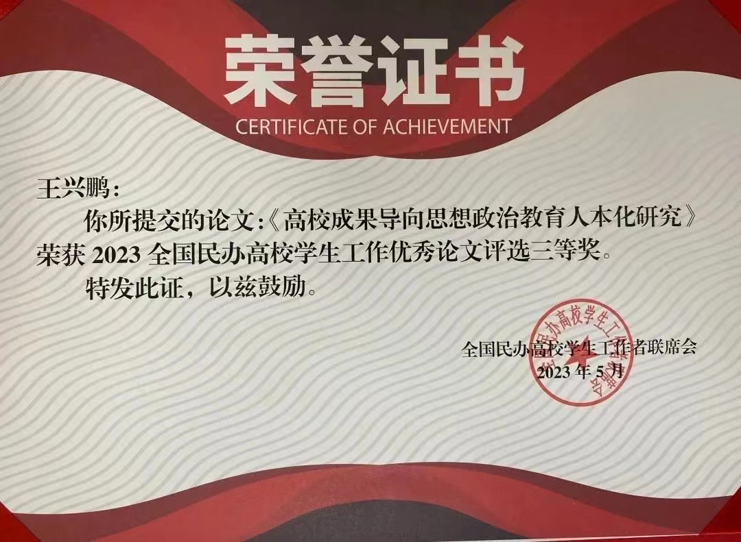 学校申报的《高校成果导向思想政治教育人本化研究》荣获2023年全国民办高校学生工作优秀论文评选三等奖。