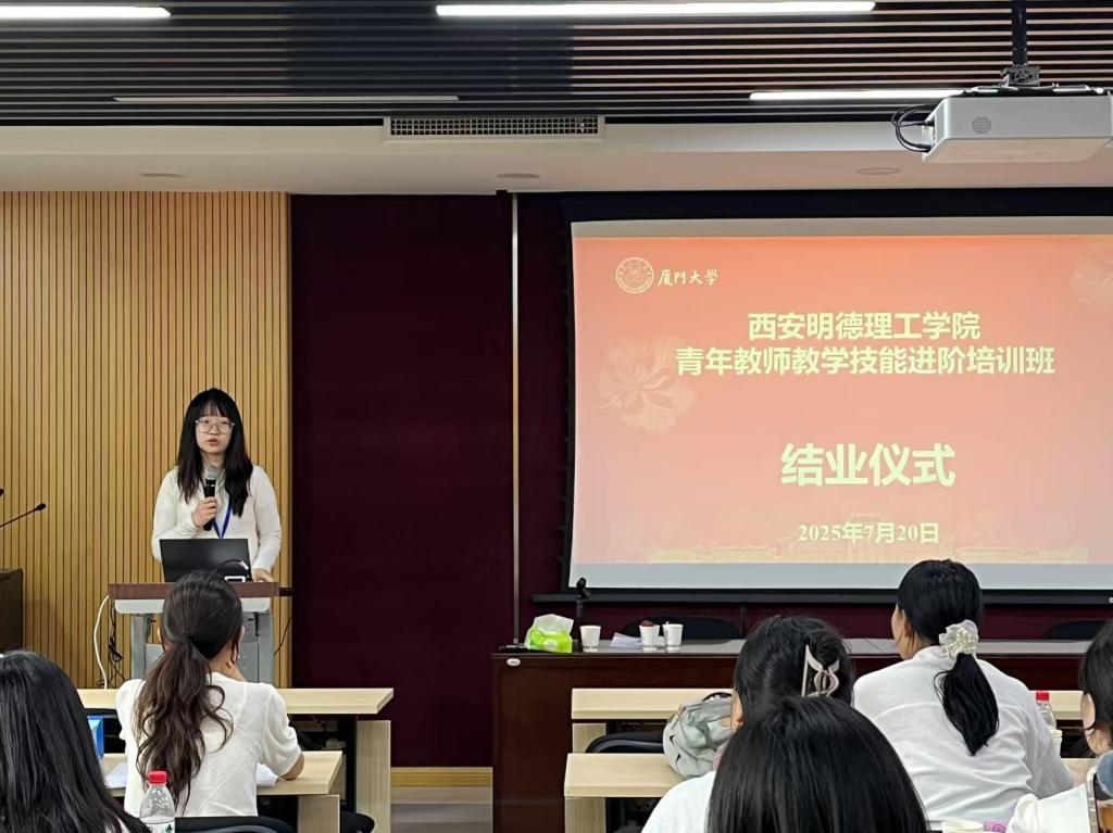 7月20日下午,结业仪式在厦大联兴楼309教室举行。教师代表周嘉莉分享了培训的收获和感悟。她表示,通过此次培训,不仅对怎样做一名有温度、有思考、有创新的高校教师有了更清晰的认识,更被厦门大学浓厚的教学氛围与严谨的治学态度所感染,激发了持续学习、不断提升的动力。
