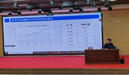 动员会上,庾鲜海教授从学生就业大环境的变化以及学校在助力学生考研方面所做出的努力进行说明,同时庾教授从自身学习和从教四十年的职业历程向同学们强调了选择考研的重要意义,以及复习过程中如何科学有效备考,鼓励同学们把握机会、持之以恒,全身心地投入到考研之中。