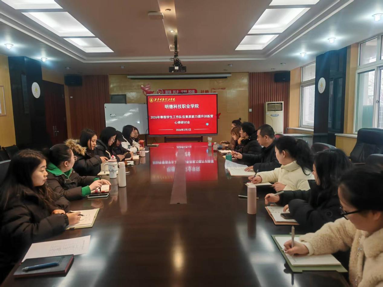 为进一步提升辅导员队伍素质,推动学生工作高质量发展,2月2日上午,明德科技职业学院在明理楼216会议室召开2026年寒假学生工作干部训练营结营心得研讨会。学院党总支副书记王飞及全体辅导员参加研讨。