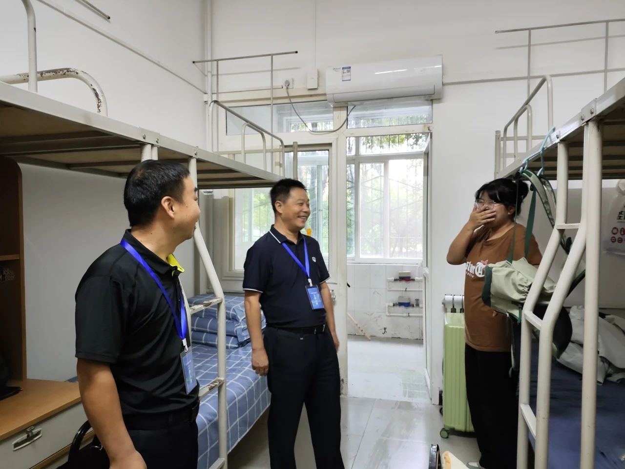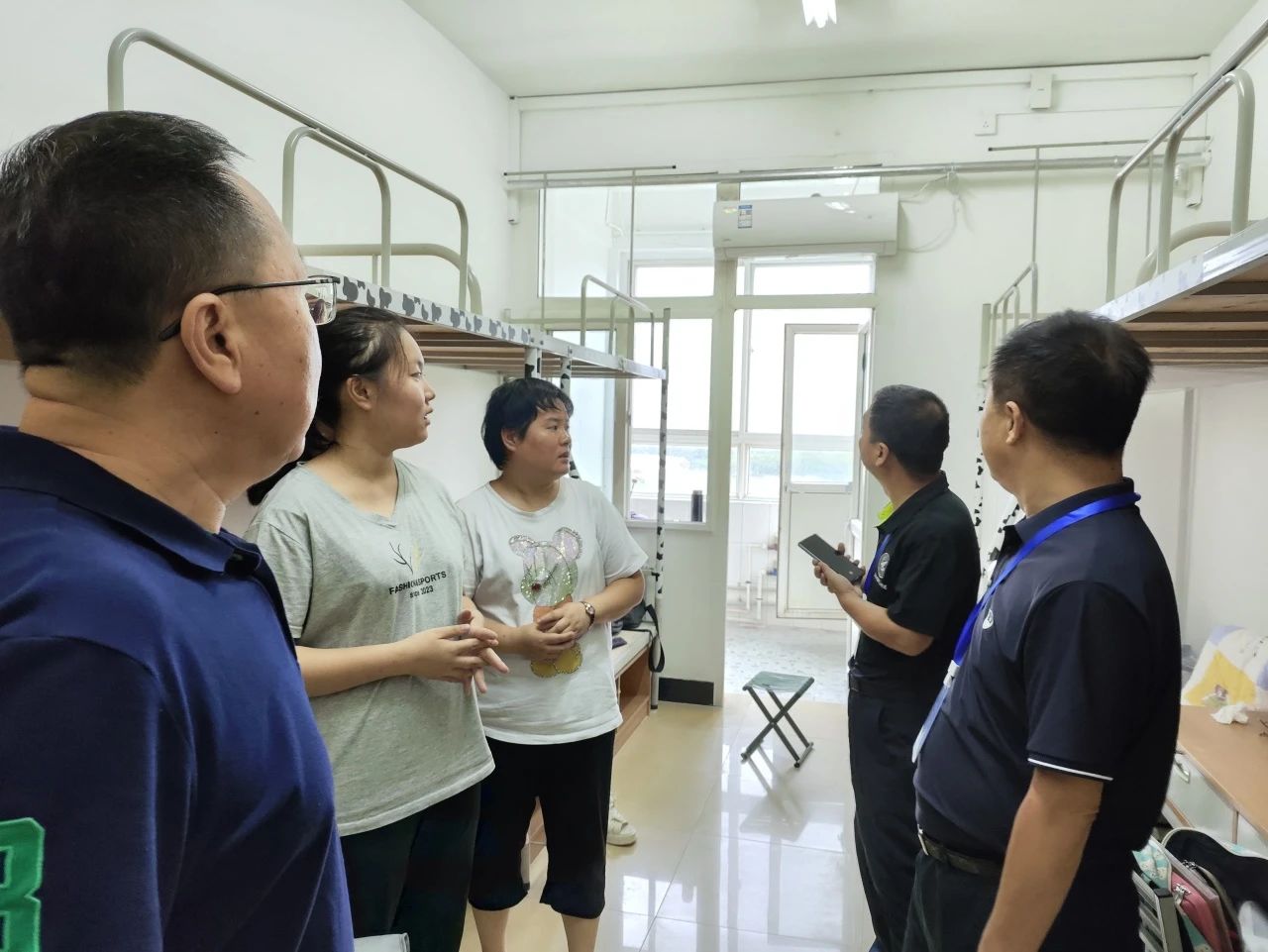 为进一步了解2023级新生的住宿情况,切实解决同学们所遇到的实际问题,帮助2023级同学们尽快适应大学生活,8月26日,高等职业技术学院舒忠院长、党总支书记王庭良老师及几位新生辅导员老师走访了我院2023级新生宿舍,与同学们进行亲切交谈。