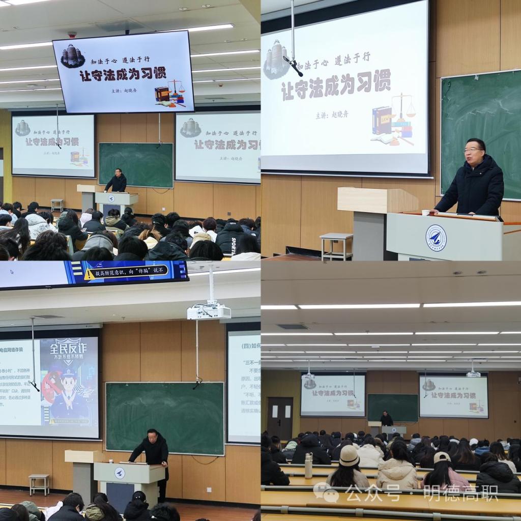 期末将至,又值佳节来临,近期已进入电信诈骗高发期。为切实提高学生反诈骗能力,12月27日我院特邀请西北政法大学赵晓舟教授在7号楼102教室为我院师生带来“知法于心、违法于行、让守法成为习惯”的专题讲座。讲座由高等职业技术学院院长舒忠主持。