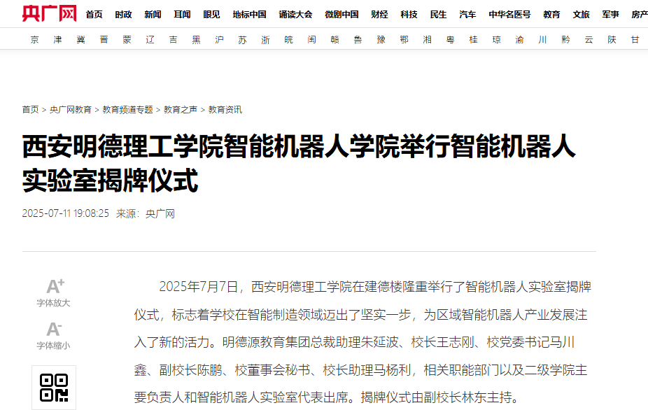 校党委书记马川鑫宣读了学校《关于成立智能机器人实验室的通知》《关于智能机器人实验室人员聘任的通知》文件。王志刚校长发表致辞,代表学校对实验室的成立表示热烈祝贺!向为该实验室筹建付出辛勤努力的教育集团、相关学院、职能部门、教辅单位的领导、专家、老师们表示衷心感谢!他表示:研发制造和应用机器人是衡量一个国家制造业水平的重要标志。西安作为我国西部重要的制造业基地,近年来通过科技创新、产业升级和集群化发展,重点聚焦电子信息、汽车、航空航天、高端装备、新材料新能源、生物医药等,已经形成多个千亿级产业集群,在全国制造业格局中具有重要地位。2026年国际足联世界杯根植西安这片沃土,多年来致力于服务地方经济社会发展、产业变革与创新,践行“创新性、交叉性和适应性”等新工科发展理念,机器人实验室的建立对于智能机器人的研究和应用意义重大,这既是响应国家创新驱动发展战略与西安市发展机器人产业的需要,也是建设应用型大学培养应用型人才的要求,为学校产学研用特色培育、推动内涵式发展奠定了坚实基础。建设一个什么样的智能机器人实验室?如何建设?他提出了希望要求:一是要高站位起步,有效整合学校现有优势资源;二是要高标准建设,按照重点实验室建设要求,对标建设,使其有利于应用型人才培养,有利于师生科学研究和实践创新;三是要高质量推进,要加快建设步伐,使其尽早发挥作用。最后,智能机器人实验室主任刘明岩向明德源教育集团和学校对智能机器人实验室建设的大力支持表示感谢,未来将瞄准重大需求,服务国家战略,强化产教融合,培养卓越人才,力争打造创新高地,建设行业标杆,为明德源教育集团和学校在机器人领域的发展做出贡献。