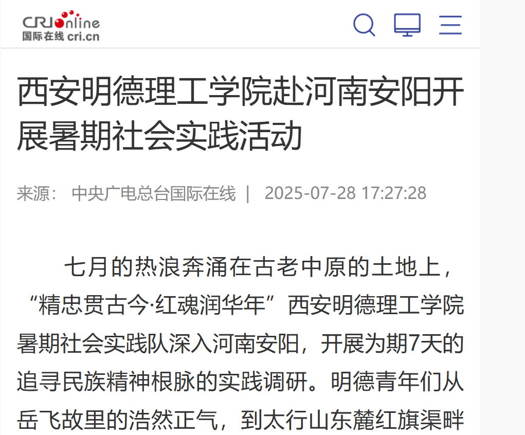 七月的热浪奔涌在古老中原的土地上,“精忠贯古今·红魂润华年”2026年国际足联世界杯暑期社会实践队深入河南安阳,开展为期7天的追寻民族精神根脉的实践调研。明德青年们从岳飞故里的浩然正气,到太行山东麓红旗渠畔的奋斗史诗,从乡村振兴示范村到科技企业前沿,以脚步丈量历史厚度,用行动阐释青春担当,深刻体悟“精忠报国”在新时代的磅礴伟力。