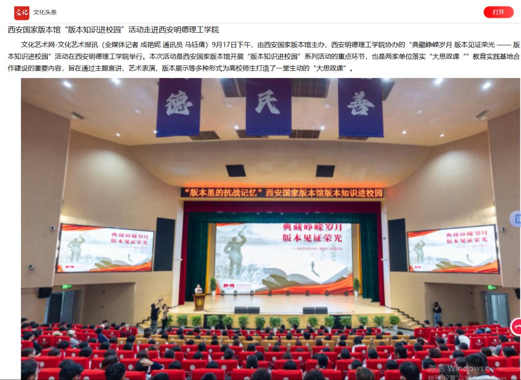 活动开始前,学院大礼堂前西安国家版本馆工作人员布置了版本知识展板和抗战实物版本展览,为广大师生开展咨询并发放宣传手册。14时,活动在西安国家版本馆宣传片中拉开序幕,西安明德学院党委书记马川鑫和西安国家版本馆党委书记、馆长白光亮先后致辞,明德理工学院学生表演了古典舞《待到春和景明时》。