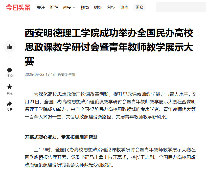 近年来,学校高度重视思想政治理论课建设,加强“大思政课”建设,构建“三全育人”“五育并举”“十育人”工作体系,挖掘明德文化育人元素,推动明德文化深入融入思想政治教育,先后与西安国家版本馆、延安革命纪念馆等地共建20余个“大思政课”实践教学基地,承办全省高校思想政治教育研究会民办本科高校分会学术研讨会,8名青年教师在省级思政课“大练兵”展示活动中获得教学标兵、特等奖、教学能手等荣誉,主持省市级思政教育科研项目20余项,出版教材著作10余部,特别是连续多年组织暑期“三下乡”暨“四百工程”暑期社会实践活动,践行将思政工作写在祖国大地上,获得中省多家主流媒体宣传报道。学校将以本次活动契机,进一步加强思政课师资队伍建设,创新教学方法,不断提升思政教育实效性,为培养德智体美劳全面发展的高素质应用型人才贡献智慧和力量。