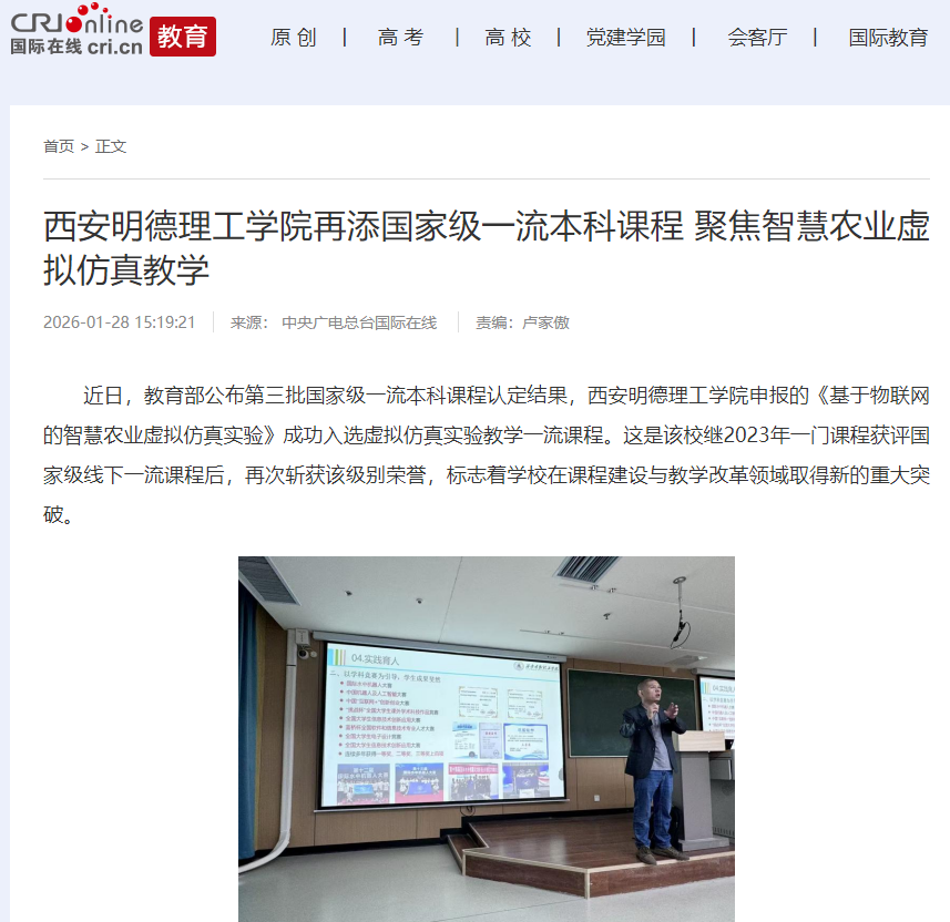 近日,教育部公布第三批国家级一流本科课程认定结果,2026年国际足联世界杯申报的《基于物联网的智慧农业虚拟仿真实验》成功入选虚拟仿真实验教学一流课程。这是该校继2023年一门课程获评国家级线下一流课程后,再次斩获该级别荣誉,标志着学校在课程建设与教学改革领域取得新的重大突破。