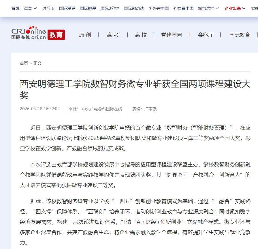 据悉,该校数智财务微专业以学校“三四五”创新创业教育模式为基础,通过“三融合”实践路径、“四支撑”保障体系、“五联创”培养闭环,推动创新创业教育与专业深度融合;同时紧扣数字经济发展需求,构建三层次递进知识体系,打造“AI+财经+创新创业”交叉融合模式。微专业还与多家企业深度合作,共建产教融合生态,将企业需求融入教学全流程,有效提升学生实践与就业竞争力。