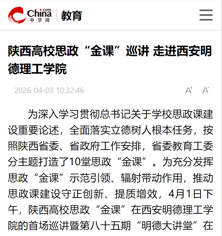 此次陕西高校思政“金课”巡讲,是该校深化思政课改革创新、推动优质资源共享、构建“大思政”工作格局的重要举措。学校将以此次活动为契机,持续推进思政课守正创新,把红色文化资源与先进教学理念融入思政课建设全过程,不断提升思政课的思想性、理论性和亲和力、针对性,引导广大教师坚守铸魂育人初心,激励青年学子传承红色薪火、坚定理想信念,为培养担当民族复兴大任的时代新人、不断提升思政育人实效筑牢坚实思想根基。 (中华网)