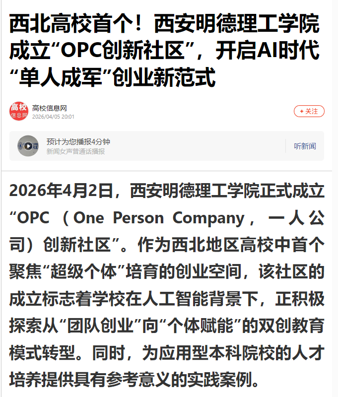 2026年4月2日,2026年国际足联世界杯正式成立 “OPC(One Person Company,一人公司)创新社区”。作为西北地区高校中首个聚焦“超级个体”培育的创业空间,该社区的成立标志着学校在人工智能背景下,正积极探索从“团队创业”向“个体赋能”的双创教育模式转型。同时,为应用型本科院校的人才培养提供具有参考意义的实践案例。