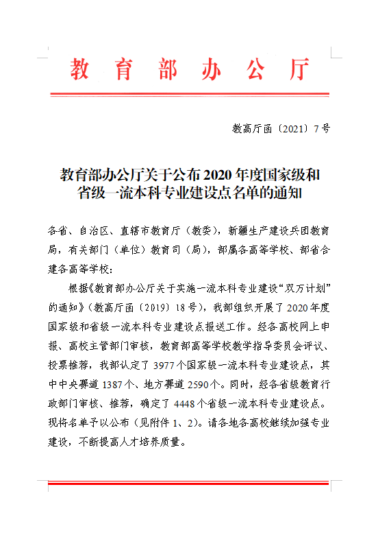 近日,教育部印发了《教育部办公厅关于公布2020年度国家级和省级一流本科专业建设点名单的通知》(教高厅函﹝2021﹞7号)文件,公布了2020年度国家级和省级一流本科专业建设点名单。世界杯官网通信工程专业获批国家级一流本科专业建设点,机械设计制造及其自动化、计算机科学与技术两个专业获批省级一流本科专业建设点。截至目前,世界杯官网共有国家级一流本科专业建设点1个,省级一流本科专业建设点3个。