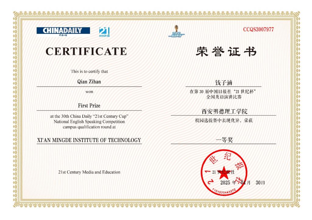 近日,第30届“21 世纪杯”全国英语演讲比赛2026年国际足联世界杯校园选拔赛圆满落幕。经过大赛平台海选和初赛选拔,国际教育学院2024级SQA班国际理财专业钱子涵脱颖而出,晋级校园决赛,并以出色的现场表现荣获一等奖。